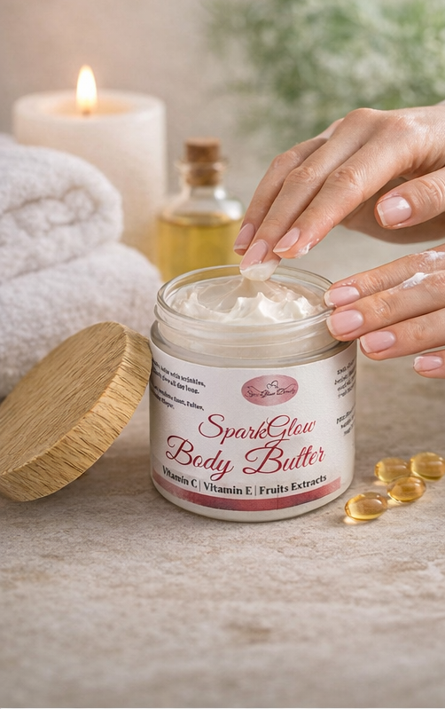 Give your skin the care it deserves with SparkGlow Body Butter, a rich, creamy moisturizer designed to deeply nourish, hydrate, and enhance your skin’s natural glow. Made with a luxurious blend of natural butters and skin-loving oils, this body butter melts smoothly into the skin, leaving it soft, radiant, and beautifully scented with a fruity fragrance and cake-frosting-like texture.