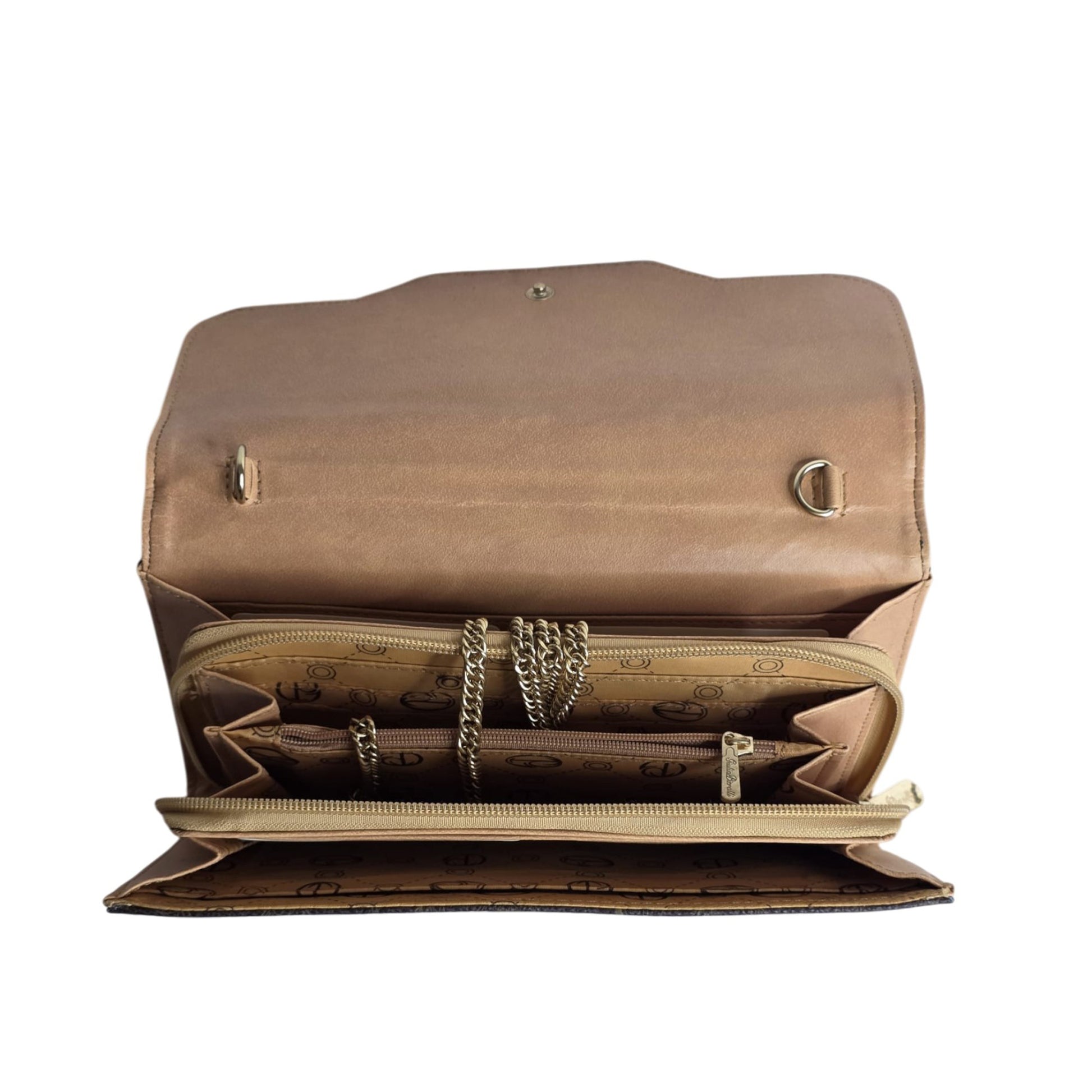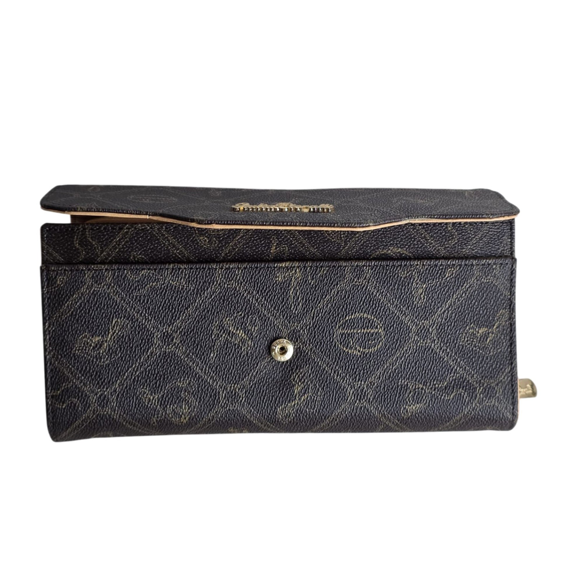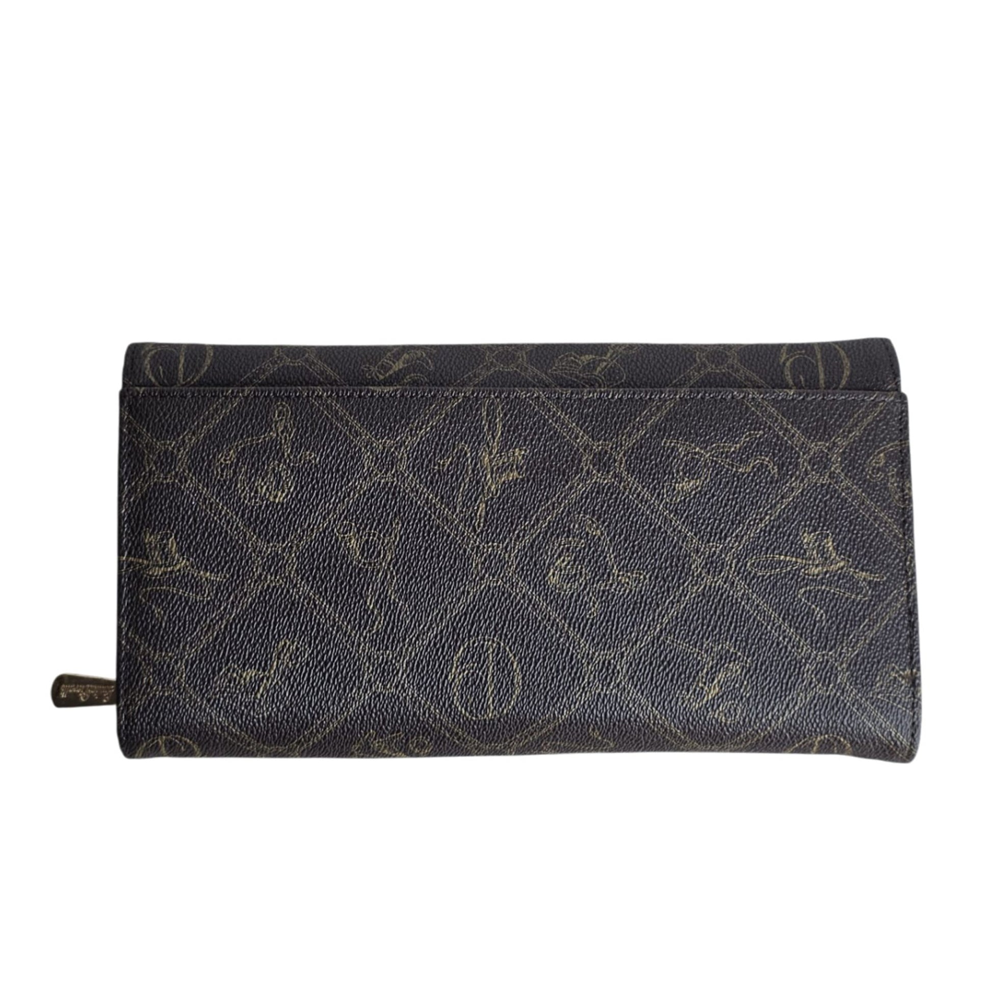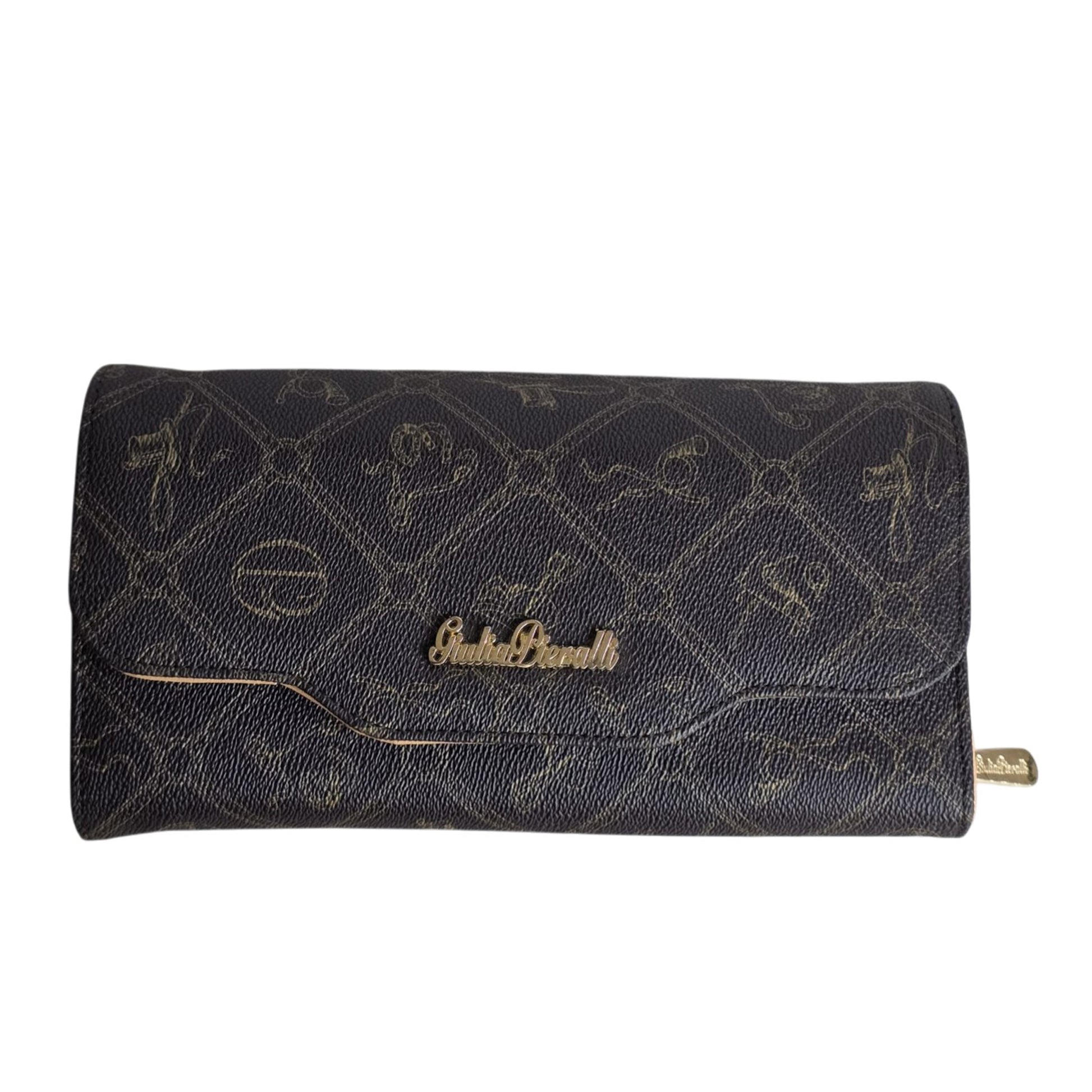 - Elegant brown patterned design with gold-tone logo detail